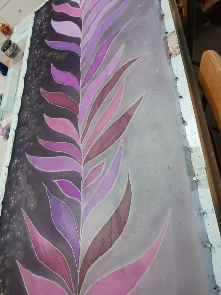 Primero preparo la seda, la estiro en bastidores en la mayoría de los casos, y dibujo delicadamente el motivo o lo esbozo. Luego, la tinta empieza a recorrer los hilos de la fibra… y es ahí donde ocurre la verdadera magia: los colores se mezclan, se expanden y se transforman en formas vivas, llenas de movimiento.
