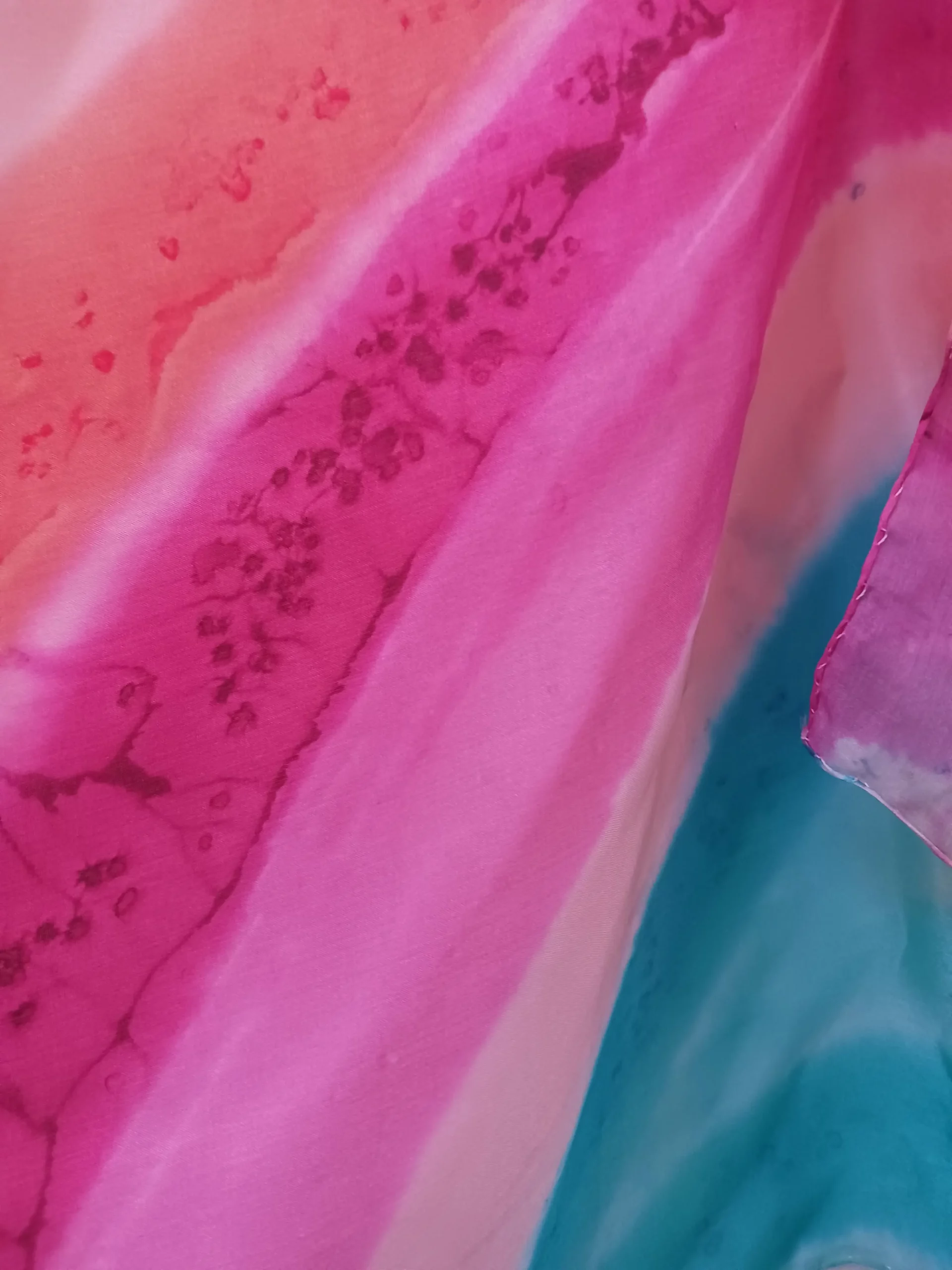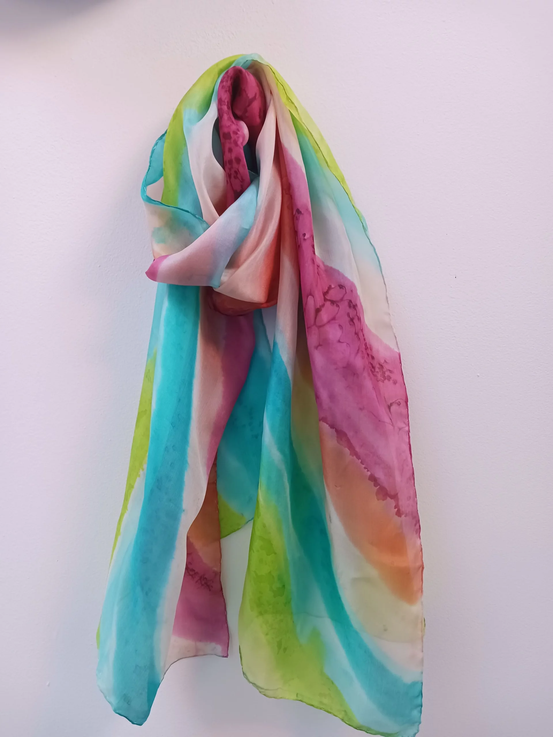 Déjate envolver por una explosión de color con este pañuelo de seda natural pintado a mano, una pieza alegre y vibrante que celebra la luz y el movimiento. Los tonos turquesa, lima, fucsia, coral y azul cielo se funden en ondas suaves que recuerdan una aurora tropical o el reflejo del sol sobre el agua en un día de verano. Una composición luminosa y refrescante que transmite alegría.