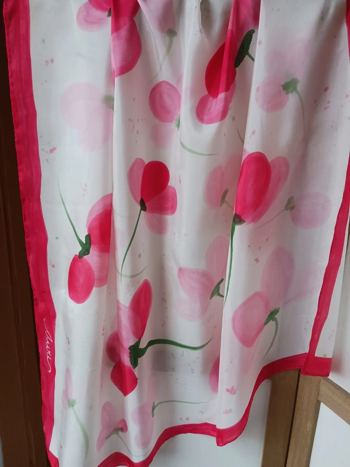 Ligero como un suspiro y alegre como una mañana de primavera, este pañuelo de seda natural pintado a mano está lleno de movimiento y dulzura. Las flores de pétalos sueltos en tonos de rosa y fucsia parecen bailar sobre el fondo blanco marfil, mientras los tallos verdes y las pequeñas salpicaduras de color añaden frescura y espontaneidad. El contorno en rosa intenso enmarca la composición con elegancia. Las flores sueltas que evocan libertad, Tonos rosas en varias intensidades, verde natural y borde fucsia. Perfecto para días luminosos. Ideal para primavera, verano o como regalo delicado.