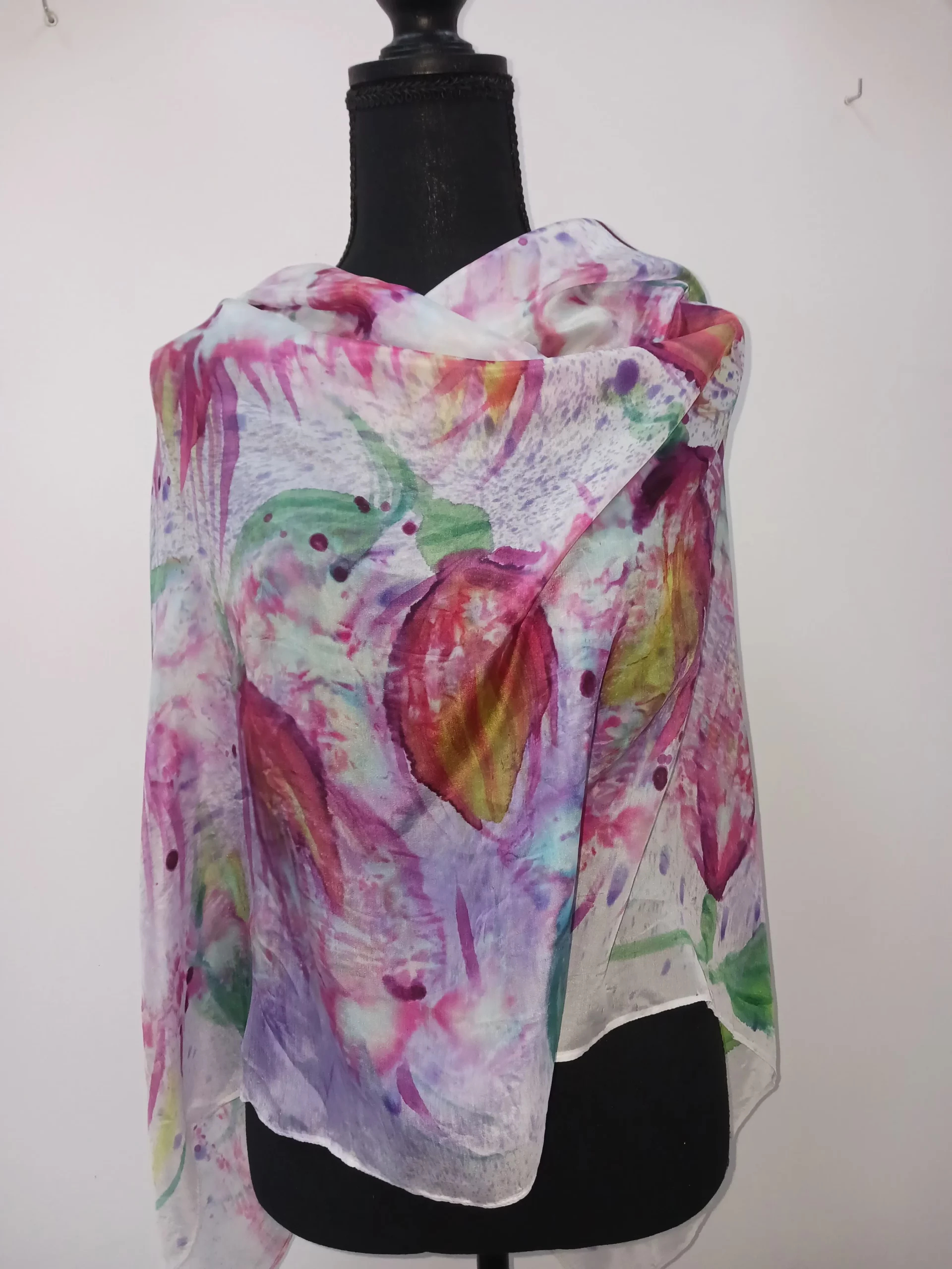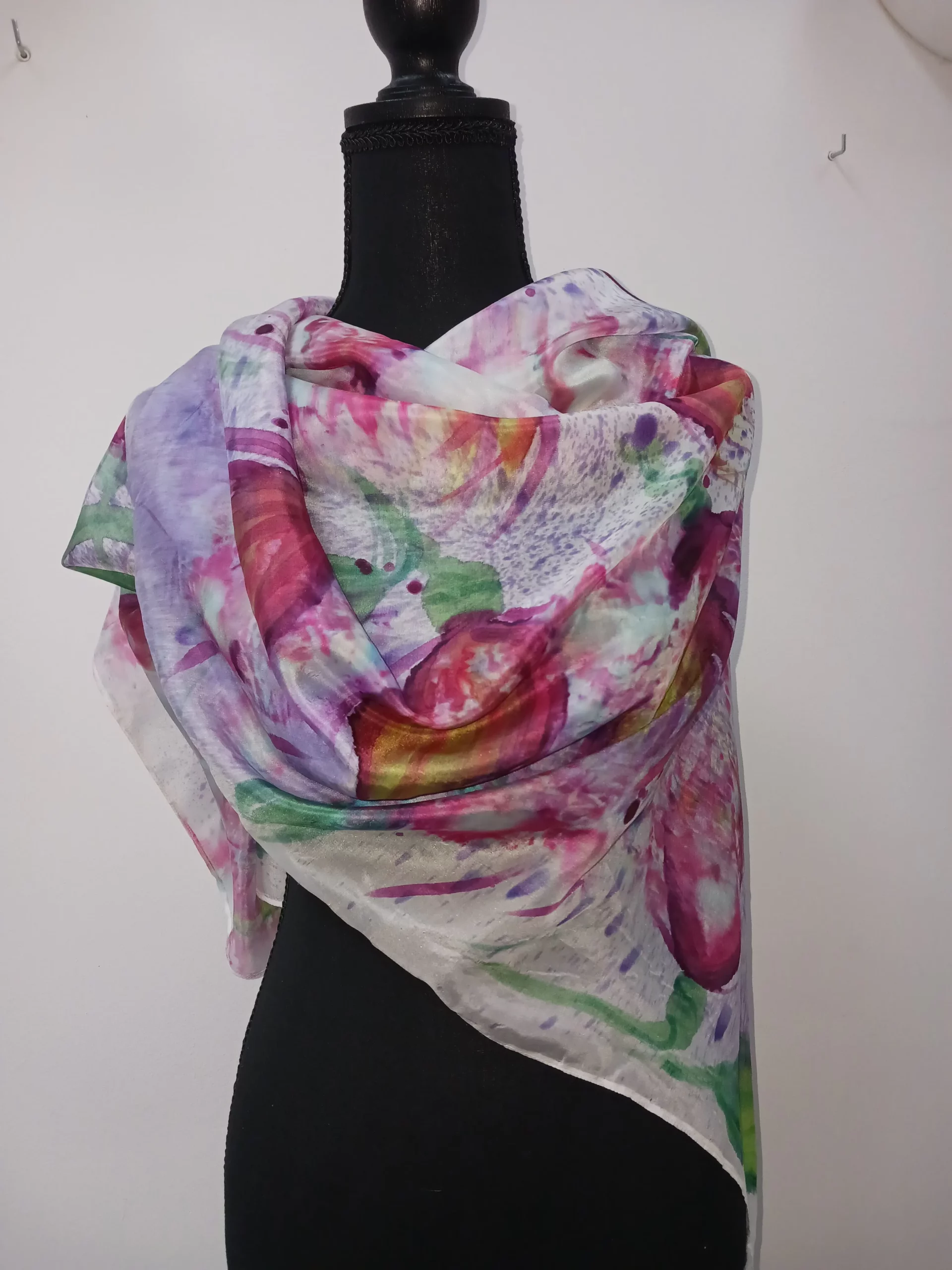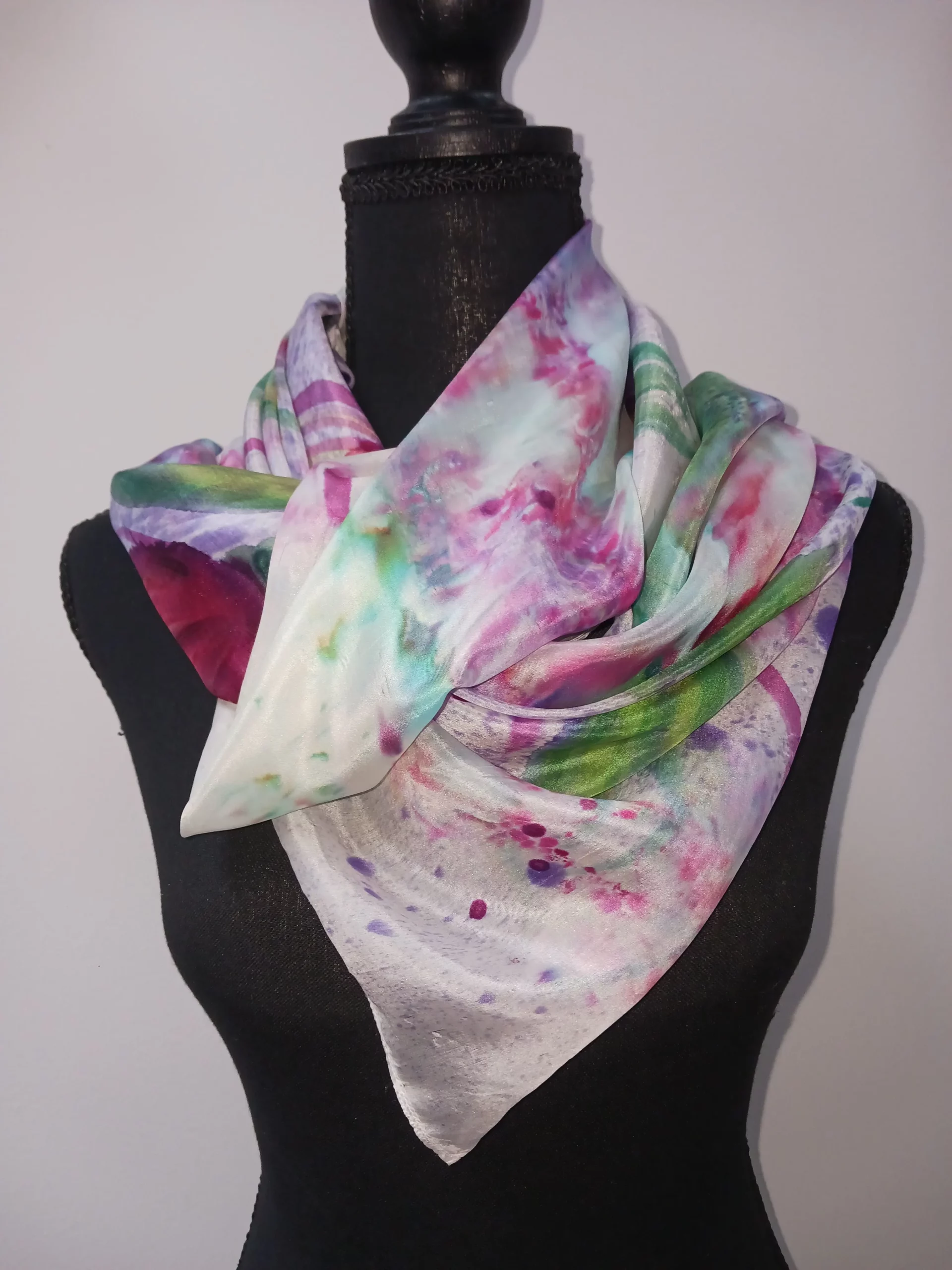 Este delicado pañuelo de seda natural ha sido pintado a mano con técnica acuarelada, creando una explosión de color inspirada en un jardín primaveral en plena floración. Cada pincelada transmite la ligereza de los pétalos y la frescura del follaje, haciendo de esta pieza una obra de arte única y atemporal. Ideal para llevar al cuello, sobre los hombros o incluso como accesorio en el cabello o el bolso, su suavidad y ligereza lo convierten en un complemento elegante para cualquier ocasión.
